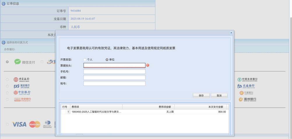 点击支付方式(微信或支付宝)或银行名称,并在左下角填入发票信息。