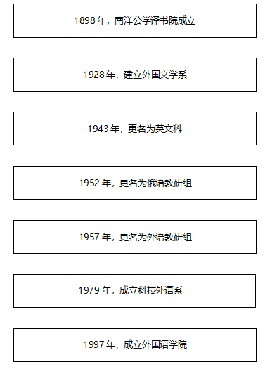 上海交通大学的外语教育拥有悠久的历史,其发端于交通大学的前身——南洋公学创立之初所设立的南洋公学译书院,南洋公学译书院是近代中国历史上第一所高校出版兼翻译机构。1928年外国文学系成立,由交大老校长唐文治之长子、著名英语专家唐庆诒教授担任主任;1943年更名为英文科,1952年更名为俄语教研组,1957年9月更名为外语教研室;1979年,率先成立科技外语系。
