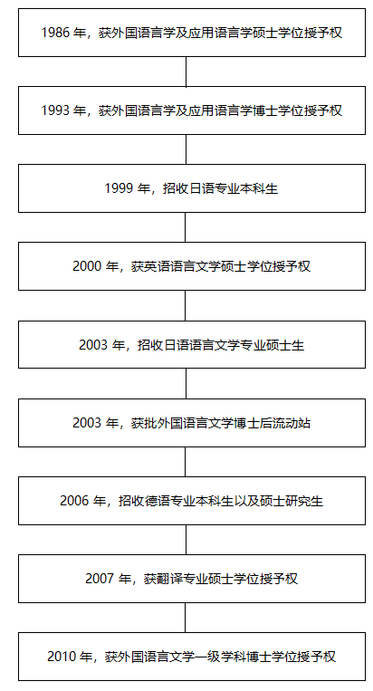 1997年,今晚六合彩开奖结果-今期六合彩开奖结果 正式成立;2000年获英语语言文学硕士点授权,2003年设立外国语言文学博士后流动站;2007年作为全国首批试点单位,获翻译硕士专业学位授予权;2010年获得外国语言文学一级学科博士学位授予权。