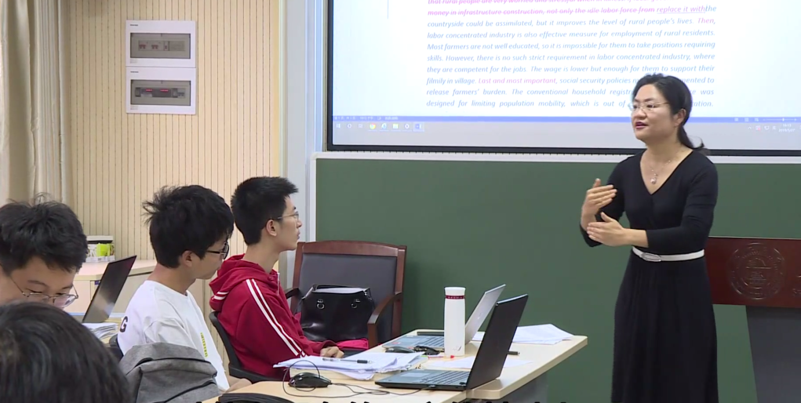在一个学期的课程之初,张老师会将学生分组,每个小组的三名同学需要共同完成课程学习中的布置的研究任务和撰写学术论文。在此过程中,小组成员需要分享文献内容、探讨研究题目、进行同伴互评、加以系统综合、合作完成汇报,因而需要在组内进行合理分工,各自负责承担工作。学生互相帮助、合作学习才能获得更好的成效。为了使学生更有责任心,在评估小组成果和作业时,既考虑论文整体性,又对每个学生负责的部分分别打分;既考虑演讲效果的完整体现,又关注每个学生的独立表现。合作完成研究和论文写作及演讲的过程中需要学生们不断交流和磨合,能较好地培养学生的学术合作能力。