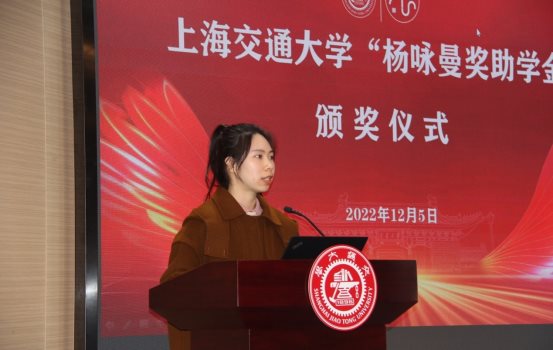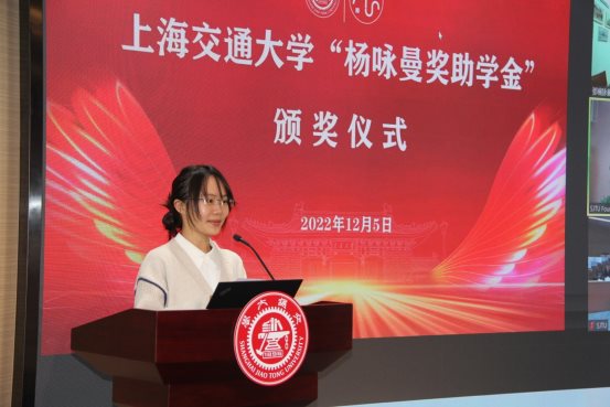 2020级外国语言文学专业博士研究生张敏玥与2020级日语专业本科生李笑寒,分别代表2021年度及2022年度上海交通大学杨咏曼优秀奖学金获奖同学发言。他们介绍了自己在校学习、科研情况和取得的成绩,并表示会一直以杨校董为榜样,饮水思源,不忘初心,不断追求卓越,用切实的行动和成绩来奉献和回馈社会,做一个对社会有用的外院人。
