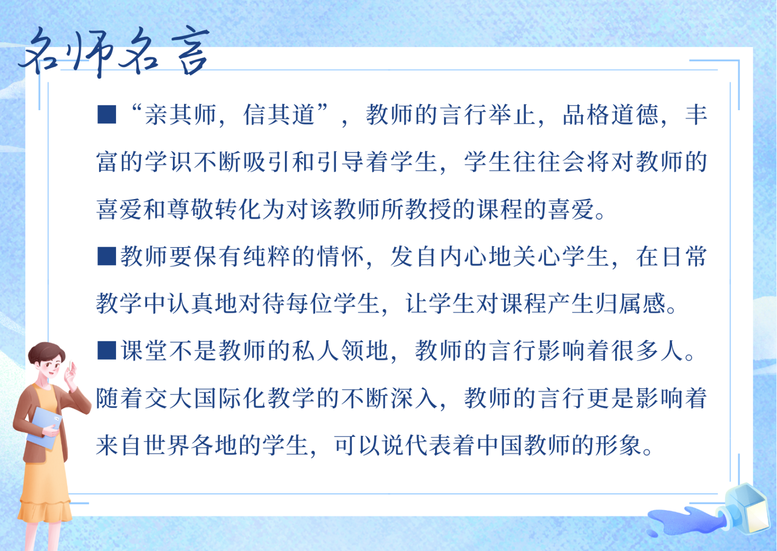 大学教师的职责是“传道、授业、解惑”。课堂不是教师的私人领地,教师的言行影响着很多人。随着交大国际化教学的不断深入,教师的言行更是影响着来自世界各地的学生,可以说代表着中国教师的形象。为了让所有学生真正理解上课的内容,曹慧老师用中文、英文、法文三语讲解授课内容,留学生评价“I am a fourth year student in Shanghai Jiao Tong University and I have taken numerous different kind of courses. But this course is my favorite. It was such an amazing class with such an amazing teacher”,“She got to know every student in the class one by one and made sure that everyone understand the content”,“Many thanks for her great effort”(学号:51603099006)