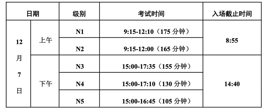 1. 本考点将于2025年12月7日(周日)举办2025B日本语能力测试(JLPT)N1-N5五个级别的考试。考试时间安排如下: