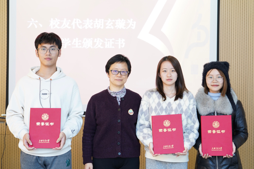 校友代表胡玄璇为三位获奖学生颁发证书并合影留念。另两位获奖同学因目前出国交流无法到现场领奖,他们预先录制了视频在现场播放,表达谢意。