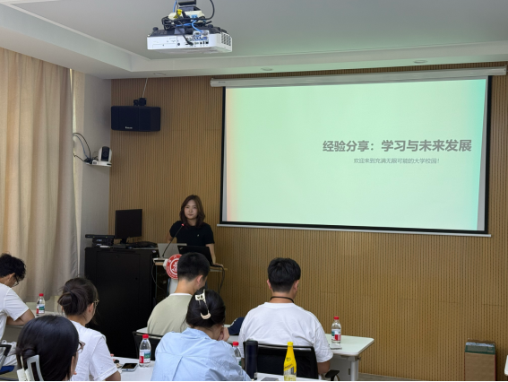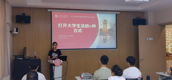 在分享环节中,日语系23级本科生张思渺结合自身日语高起点学习背景、团支书及“伯乐计划”成员等多元经历,带来了全面的经验分享。她从学习方法、心态选择、社团活动与科研实践四个方面展开:在学习上,她介绍了善用AI工具、提升信息素养的方法,并针对不同基础的同学给出听力、阅读、口语的提升建议,同时解读学积分、绩点、综测等关键指标的意义;在心态上,她鼓励大家不惧得失,勇于试错;在社团方面,她推荐“中日桥”等优质平台,分享合理选择的技巧;在科研实践上,她介绍了日语系竞赛及“大创”“PRP”等科研项目的价值与参与途径。最后,她以“提前规划、勇于尝试、主动借力、保持热情”四句箴言寄语新生,勉励大家在探索中不断成长。