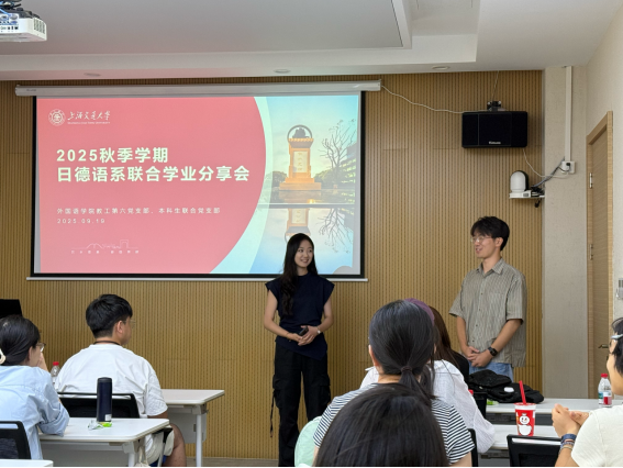 2025年9月19日下午在外语楼107会议室,第六教工党支部与本科生联合党支部共同举办2025年秋季日、德语系学业分享交流会,来自日语系、德语系的高年级同学为2025级新生做了精彩分享,高年级本科生党员代表、日语系与德语系新生以及第六教工党支部书记 王琳、25级德语班主任党员教师范黎坤、日语系班主任党员教师李思齐参加了交流活动,活动由日语系22级本科生孔莘瑶主持。