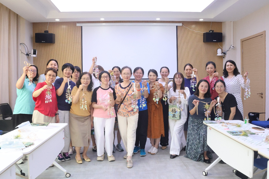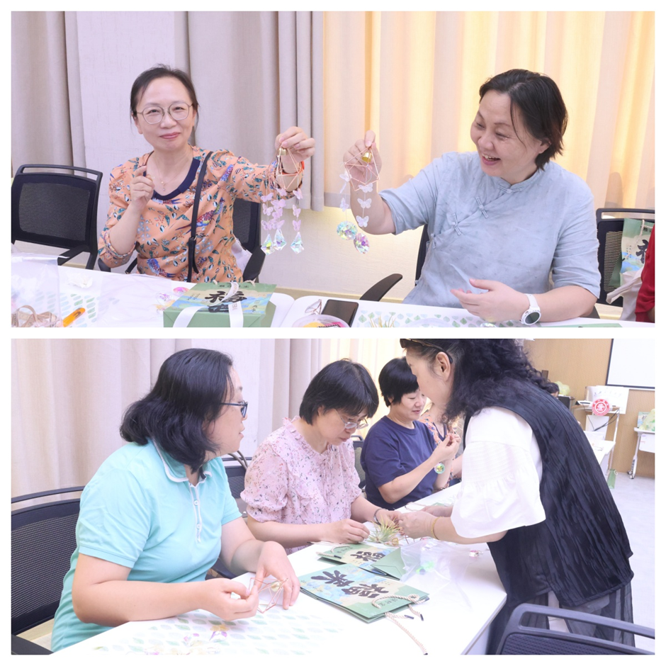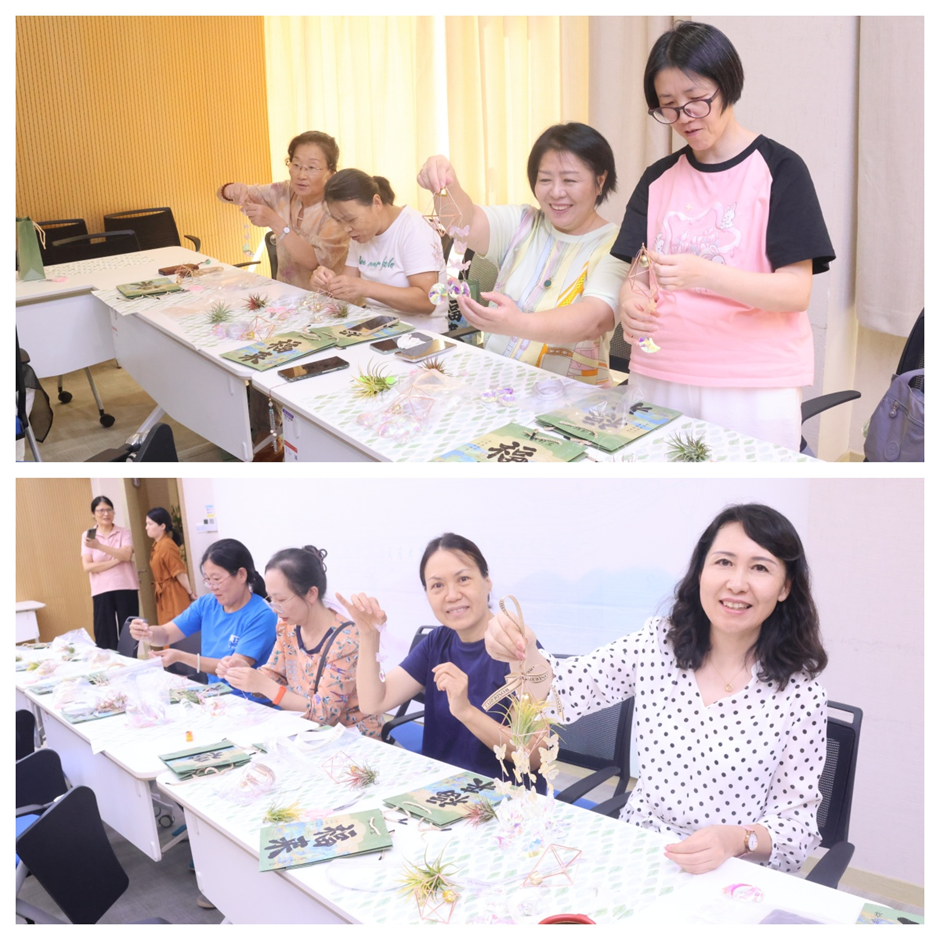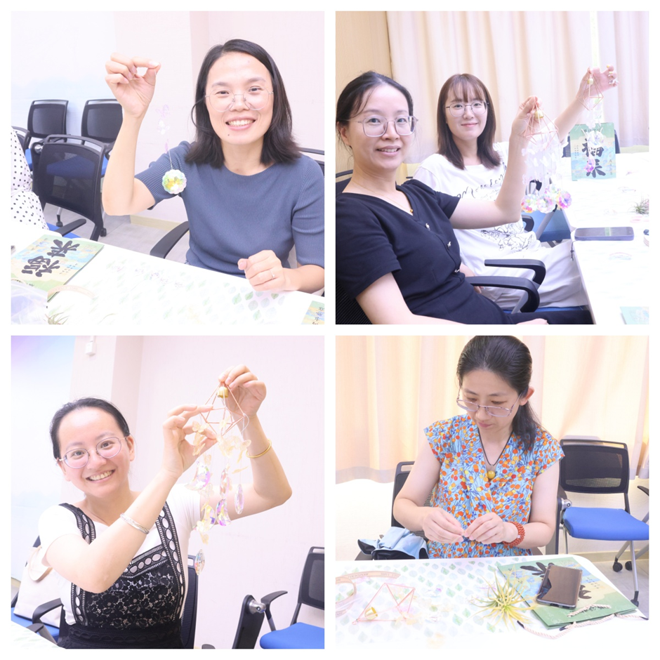 讲解结束后,大家迅速投入到创作中。现场氛围温馨而热烈,有的教职工专注地挑选材料,精心设计风铃的整体造型;有的则相互交流技巧,分享彼此的创意灵感。指尖穿梭间,原本零散的材料逐渐变成了一个个独具特色的风铃雏形。经过精心制作,一个个造型别致、充满巧思的风铃相继完成。当大家轻轻晃动手中的风铃,清脆的 “叮铃” 声此起彼伏,仿佛在诉说着创作的喜悦。