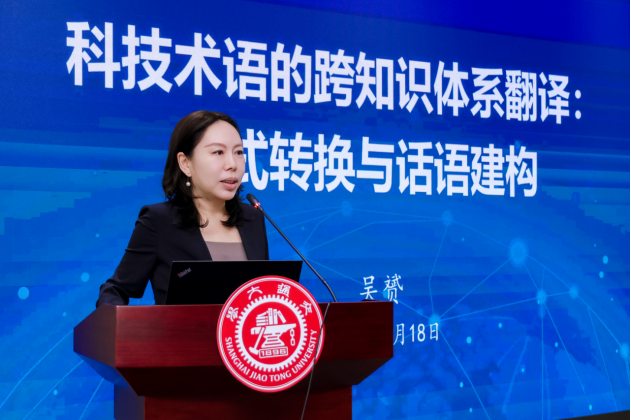 同济大学吴贇教授在题为“科技术语的跨知识体系翻译:范式转换与话语建构”的主旨演讲中,考察了“量子”“细胞”“气候正义”等科技术语在汉语语境中的引入与演化历程,深入剖析了术语建构的逻辑脉络与本土化策略。