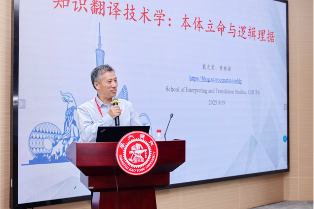 广东外语外贸大学戴光荣教授在大会上作了题为“知识翻译技术学:本体立命与逻辑理据”的主旨演讲。他立足技术哲学与翻译知识的双重视域,系统剖析了该学科本体立命与逻辑理据两大核心哲学命题。