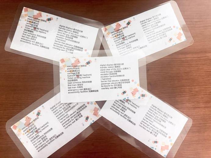 随后,一场别开生面的“口语微课堂”随即展开。志愿者们通过情景对话,生动地教授了地铁出行相关的实用英语表达。活动尾声,同学们向地铁工作人员赠送了精心准备的“出行锦囊卡”,卡片收录了如换乘指引、票务咨询等高频问答,设计小巧,方便随身携带。