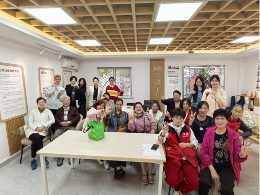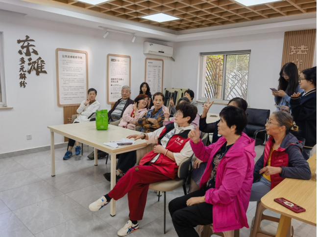 随后,袁奕淳同学继续带领大家开展“吟民谣,忆老友”韵律训练活动。通过将语言与节奏韵律相融合,老年居民们在轻松愉悦的环境中锻炼了听力与记忆能力,现场气氛温馨而活跃。