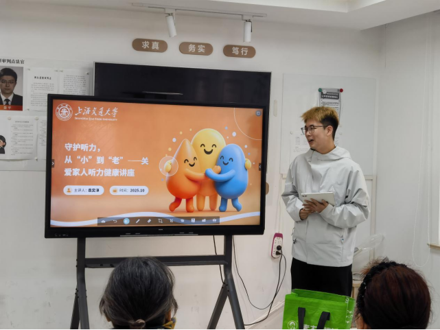 接下来,袁奕淳同学为居民们带来了第一期趣味科普讲座:“从宝宝到老人,守护听力的幸福密码”。讲座从五个关于耳朵与听觉的趣味冷知识入手,重点讲解了“早发现”与“急就医”在儿童听力干预及老年人突发性耳聋中的关键作用,并引导大家牢记“黄金3天”的最佳就诊时机。讲座内容生动有趣,讲解风格轻松幽默,老年朋友们在愉快的氛围中加深了对听力保健的认识。